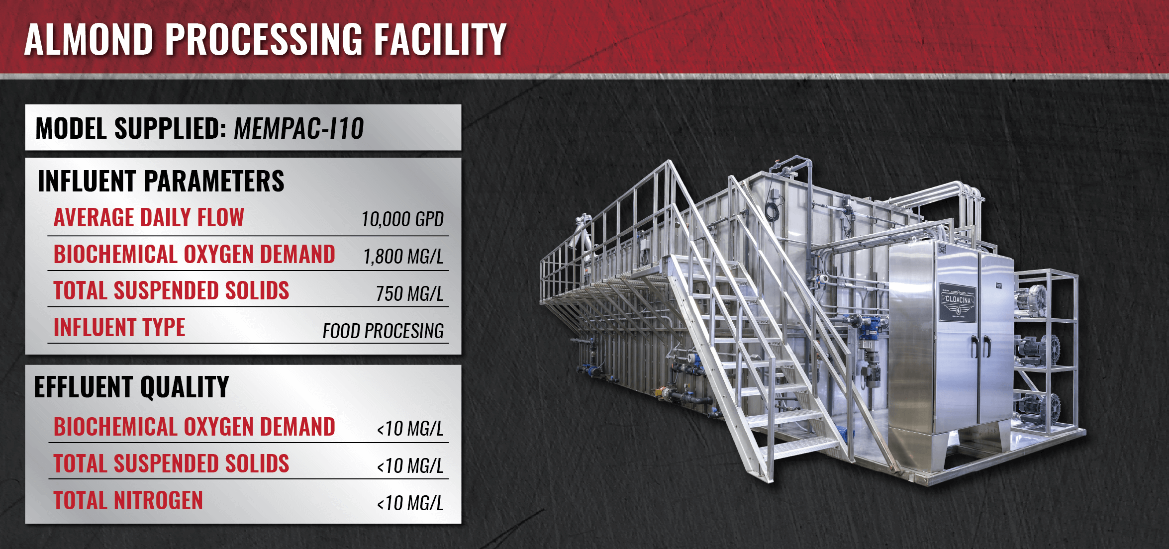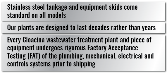 Cloacina’s MEMPAC-I, designed for high loading, is manufactured from stainless steel to combat the corrosive elements found in process waste. An automatic pH adjustment system with nutrient addition can be supplied to neutralize the waste stream. The multi-stage treatment process includes membrane clarification that reduces high BOD to within permit limits and prevents the discharge of solids into the sanitary sewer to meet discharge limitations. Solids management equipment decreases the volume of liquid waste hauled from the site. Flow can be monitored and sampled from multiple ports for reporting purposes. The advanced controls system automatically adjusts to production cycles, can be accessed by facility staff from any device with an Internet connection, alerts them when required maintenance is due and then logs tasks when completed. These features help food and beverage manufacturers meet their discharge requirements and maintain compliance with regulatory agencies.